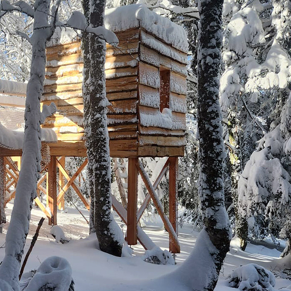 Dans le prolongement de cette démarche et afin de venir compléter et enrichir l’expérience visiteur, la collectivité Haut Béarn a reconduit TELOA et TIKOPIA dans le travail de conception et de suivi de mise en œuvre d’un aménagement pour un espace ludo-pédagogique sous la forme d’une passerelle sur-mesure à travers les arbres.